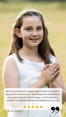 "Nach den tollen Kommunionbildern unserer älteren Tochter, haben wir uns auch dieses mal wieder entschieden zur Fotogräfin zu gehen und haben es nicht bereut :) Wir hatten noch nie so viel Spaß bei einer Fotosession und entsprechend toll ist das Ergebnis. Immer wieder gerne."
