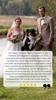 Wir haben Saskia bei meiner Freundin an der Hochzeit kennengelernt und waren von ihrer sympathischen Art total begeistert. Nun hatten wir sie selbst für unsere Hochzeitsfotos gebucht und sind mehr als begeistert! Sie hat so tolle Ideen und es hat so wahnsinnig viel Spaß gemacht! Außerdem hat Saskia Hundeerfahrung, was wir bei unserem Shooting mit Hund merkten. Sie macht das wirklich richtig toll und die Fotos sind der absolute Hammer!!! Viele Leute haben uns auf die Fotos bereits angesprochen. Wir würden sie immer wieder für Shootings buchen und auch von Herzen empfehlen! ♡