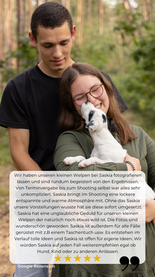 Wir haben unseren kleinen Welpen bei Saskia fotografieren lassen und sind rundum begeistert von den Ergebnissen. Von Terminvergabe bis zum Shooting selbst war alles sehr unkompliziert. Saskia bringt im Shooting eine lockere entspannte und warme Atmosphäre mit. Ohne das Saskia unsere Vorstellungen wusste hat sie diese sofort umgesetzt. Saskia hat eine unglaubliche Geduld für unseren kleinen Welpen der natürlich noch etwas wild ist. Die Fotos sind wunderschön geworden. Saskia ist außerdem für alle Fälle gerüstet mit z.B einem Taschentuch usw. Es entstehen im Verlauf tolle Ideen und Saskia ist offen für eigene Ideen. Wir würden Saskia auf jeden Fall weiterempfehlen egal ob Hund, Kind oder zu anderen Anlässen.