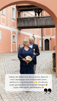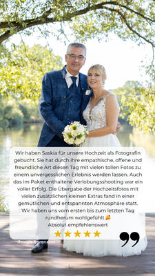 "Die Fotos von unserer Hochzeit sind ein Traum geworden! Vielen Dank nochmal 😘 Können Saskia echt nur empfehlen! Sie hält wundervolle Momente für die Ewigkeit fest. Wir waren begeistert!"
